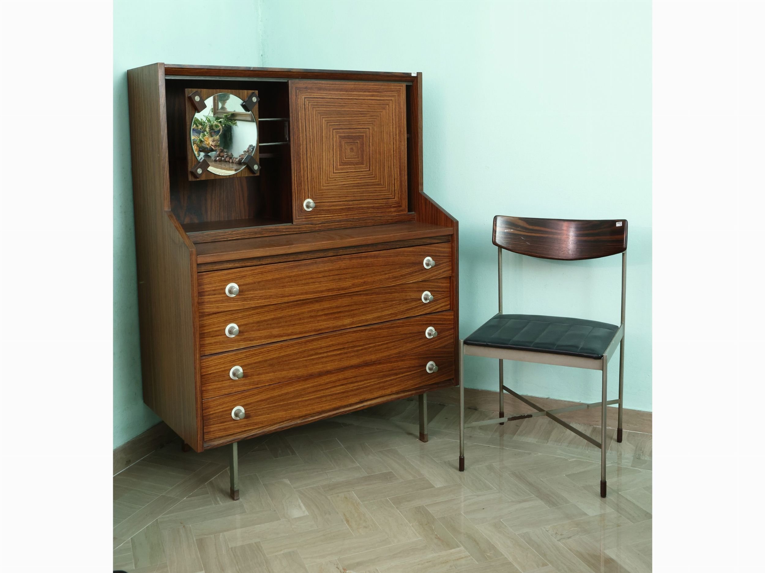 Anni Settanta uno sportello a scorrere sul fronte a celare specchio, piano a tiretto, quattro cassetti sotto la fascia, piedi e dettagli in metallo, con sedia en pendant