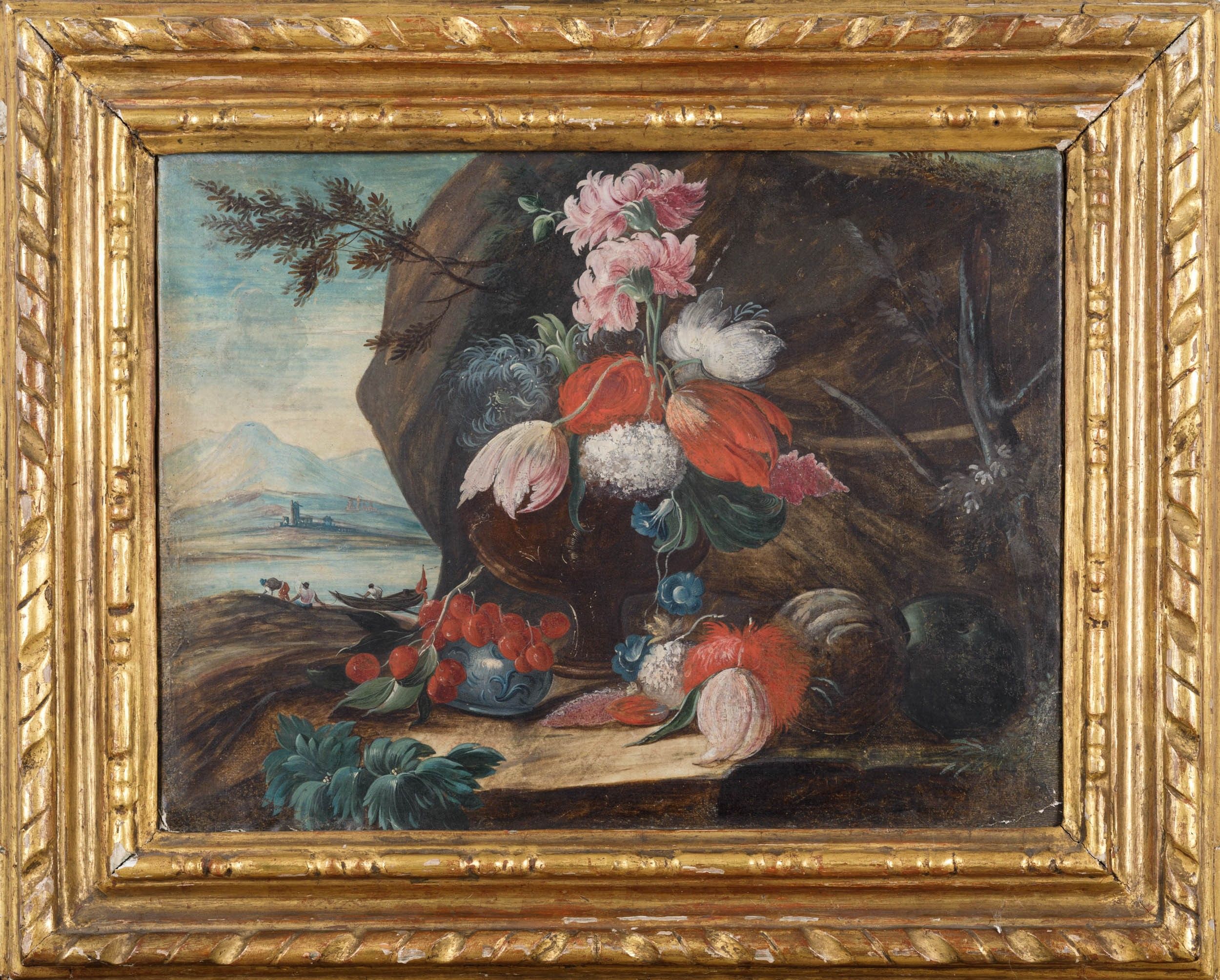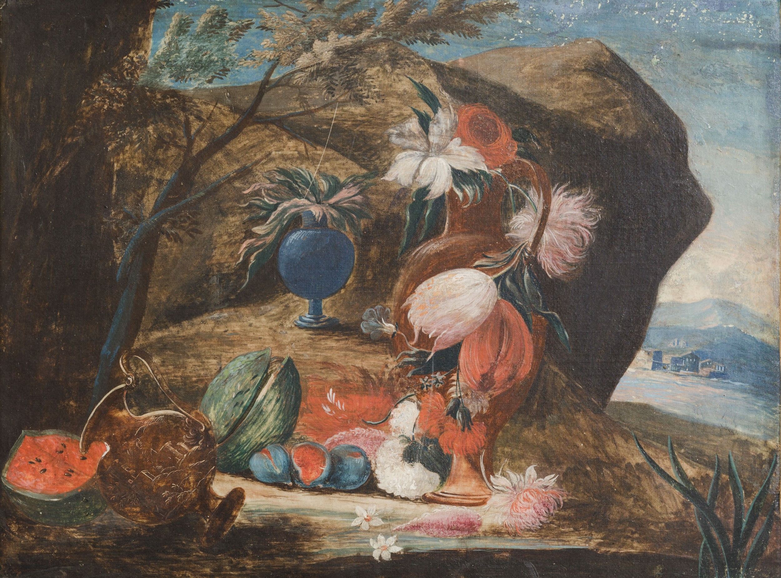 Scuola del XVIII secolo Paesaggi con composizioni di fiori e frutti