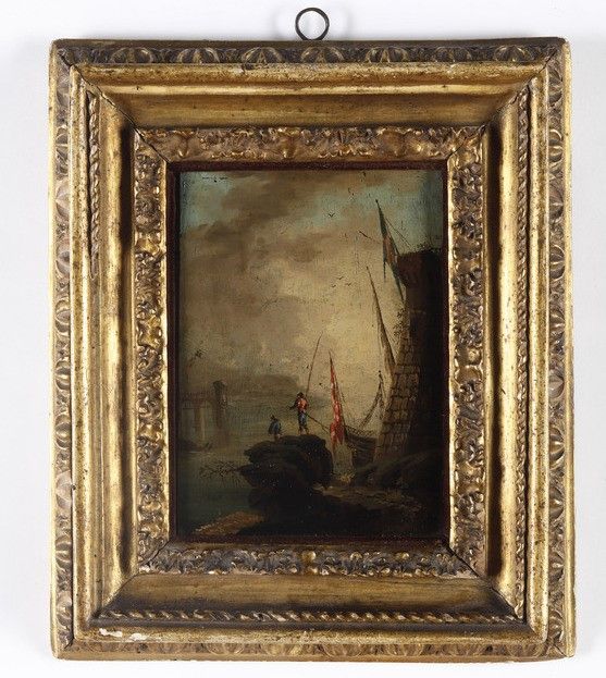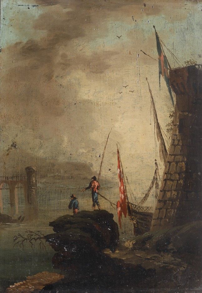 Scuola del XVIII secolo Veduta costiera con pescatori e imbarcazione