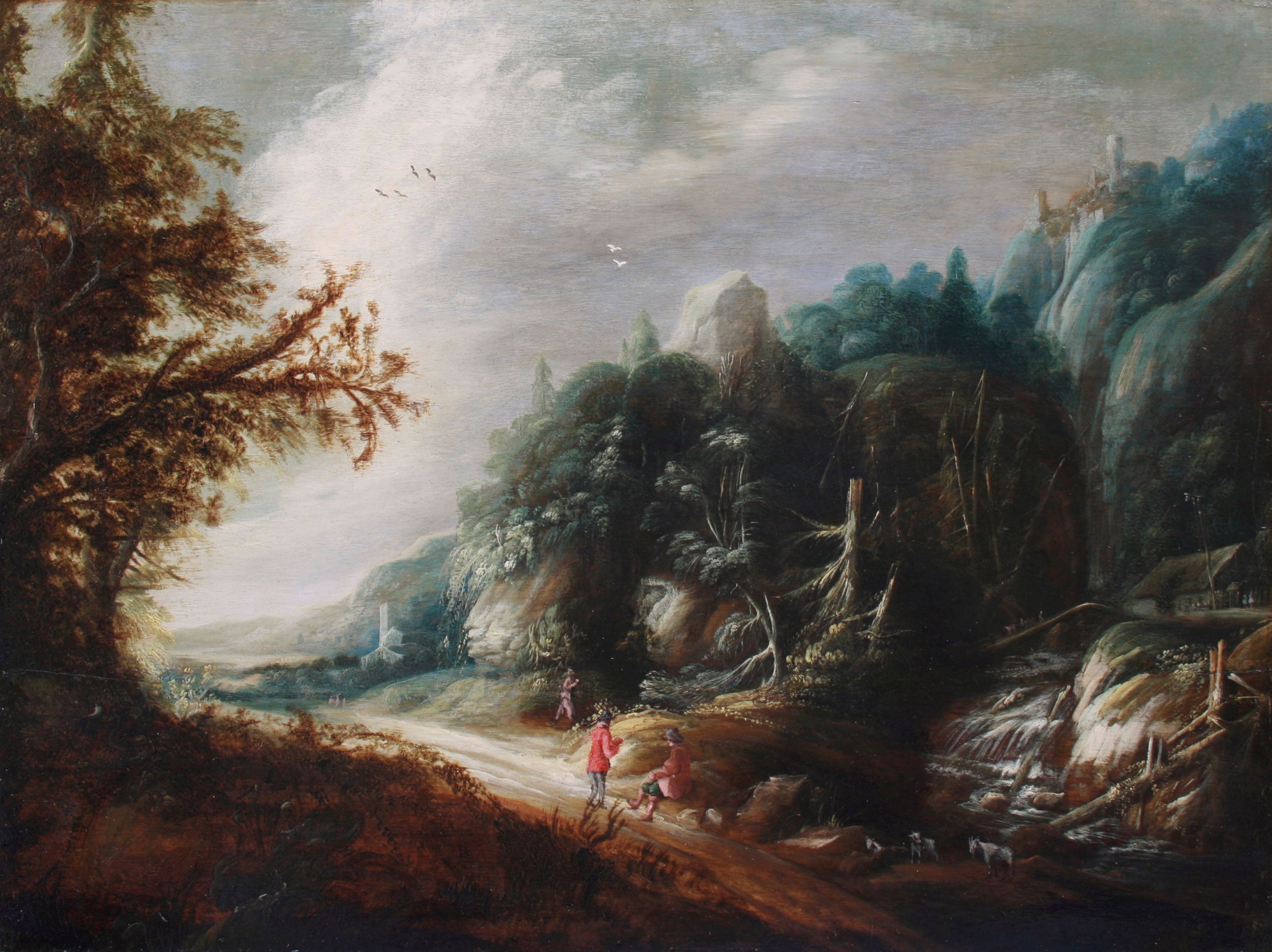 Scuola fiamminga del XVII secolo Paesaggio con viandanti