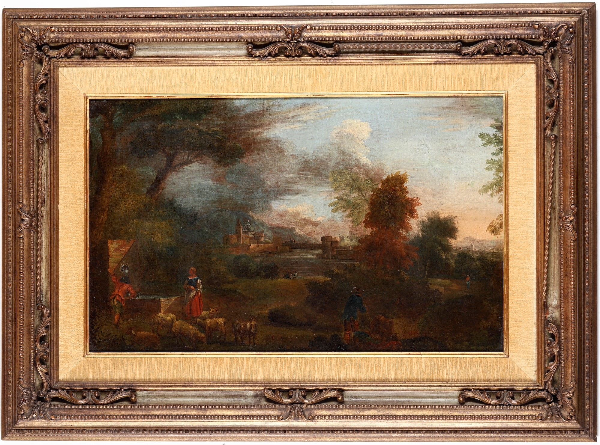 Scuola veneta del XVIII secolo Paesaggio arcadico con contadini e gregge