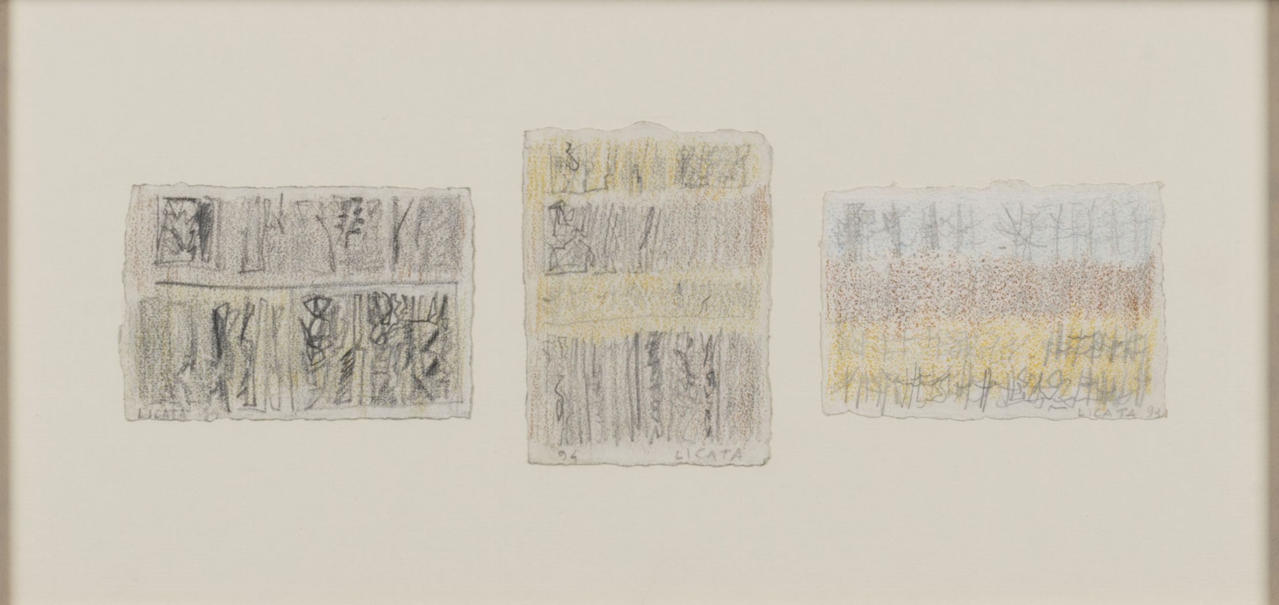 tre disegni eseguiti con pastelli colorati su carta applicata su foglio unico, cm 20 x 40 (misure dell'insieme)