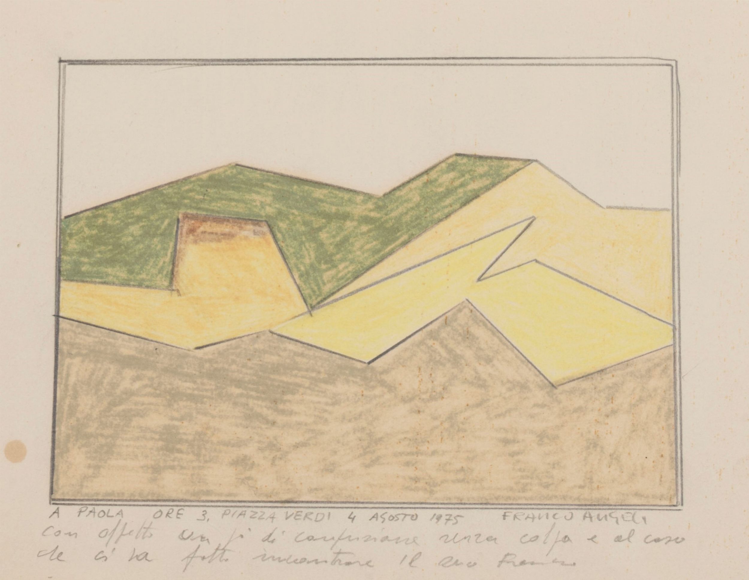 Firmato lungo il margine inferiore: Franco Angeli, ore 3, piazza Verdi, 4 agosto 1975