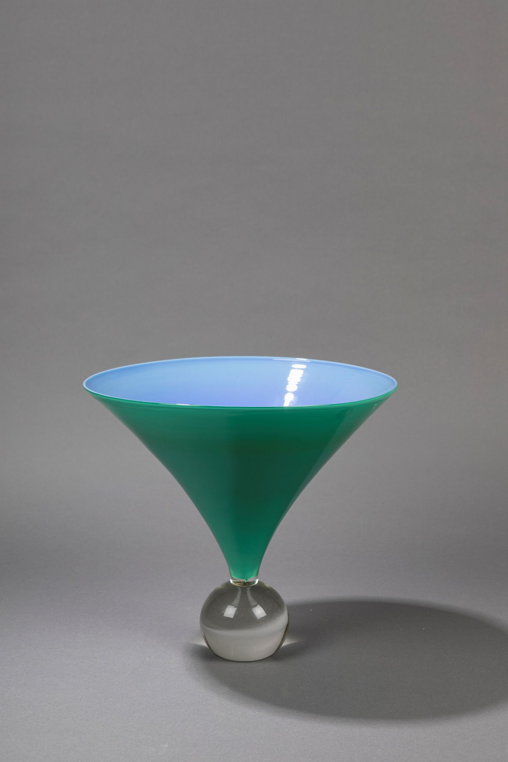 1989 Vaso con corpo di forma conica in vetro incamiciato turchese e zaffiro poggiante su sfera di cristallo incoloreProduzione Venini, Murano.Firmato a punta venini murano laura 89