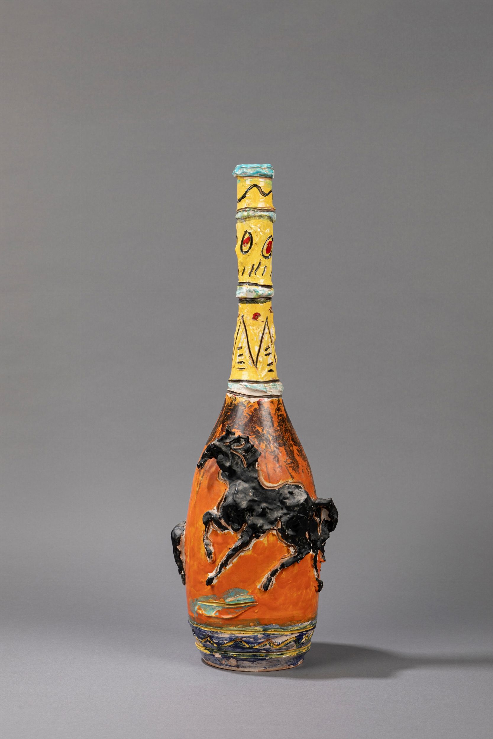 1960 ca. decorati con cavallo in ceramica lavorata a stecco e smaltata. Firma in pasta. Produzione Albissola