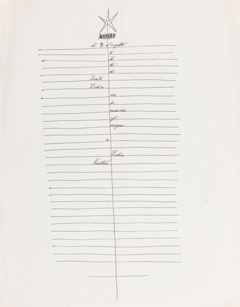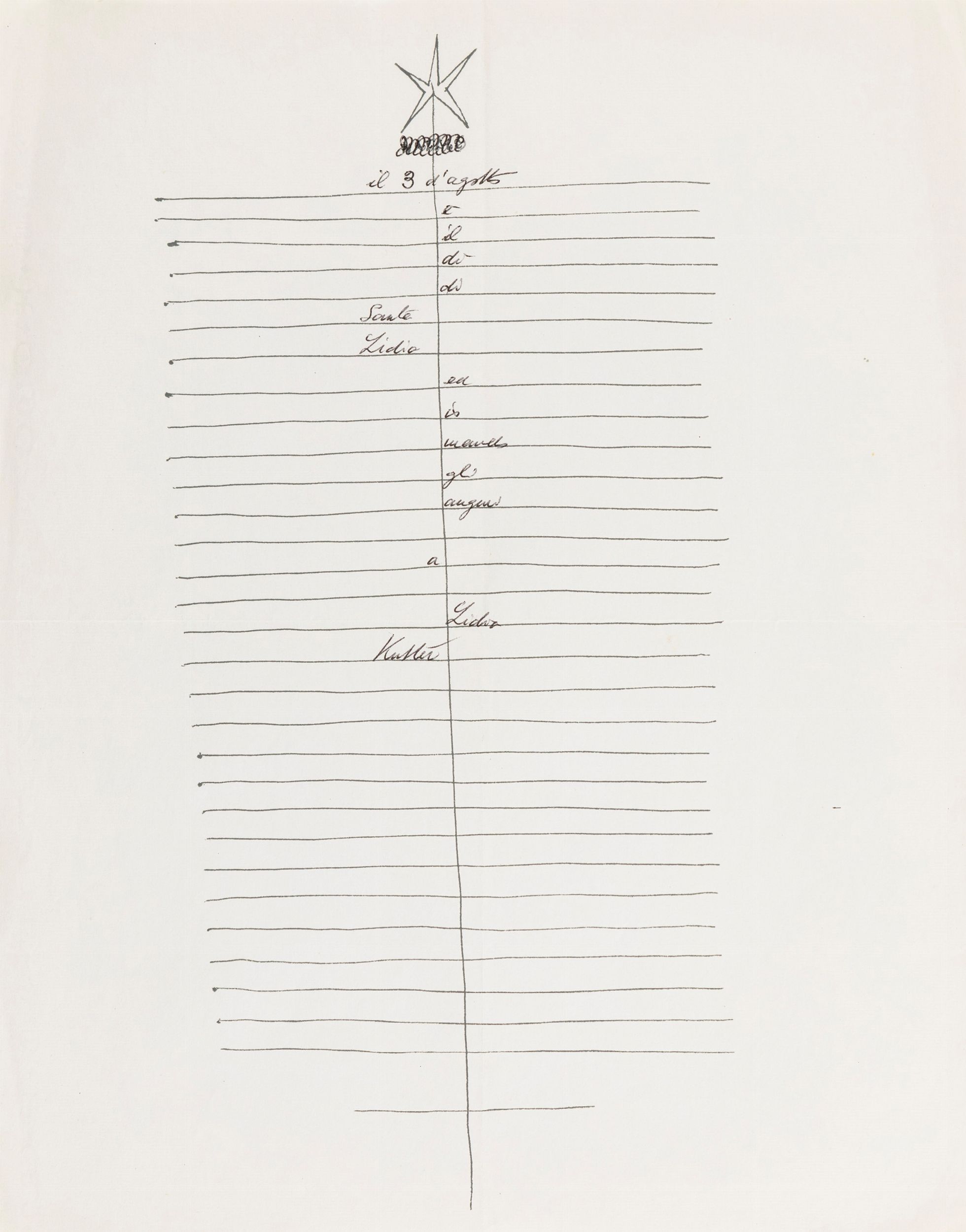 27,5 x 21,5 cm 1960 ca. Messaggio di auguri di buon onomastico con disegno di stella dedicato a Lidia Kuster Tabacchi, direttrice della rivista Novità. Inchiostro nero su carta.