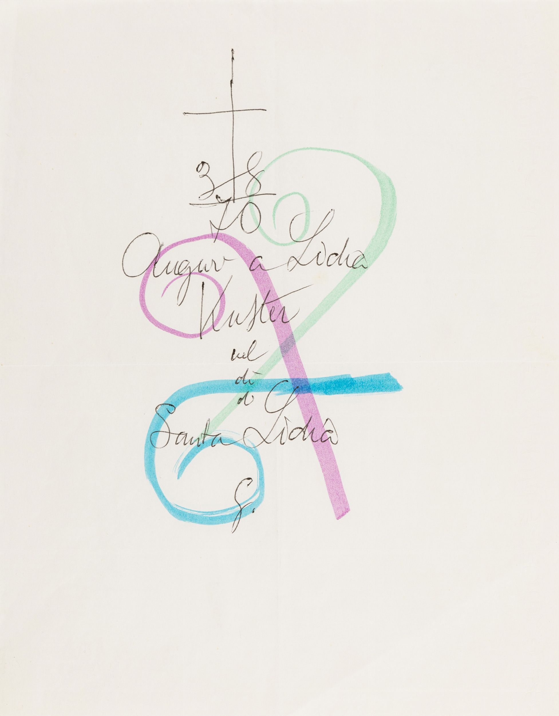 27,5 x 21 cm 1970 Messaggio di auguri a Lidia Kuster Tabacchi (direttrice della rivista Novità) per il suo onomastico. Inchiostro nero e pennarelli colorati su carta. Datato 3.8.1970. “3.8.70 Auguri a Lidia Kuster nel giorno di Santa Lidia. G.”