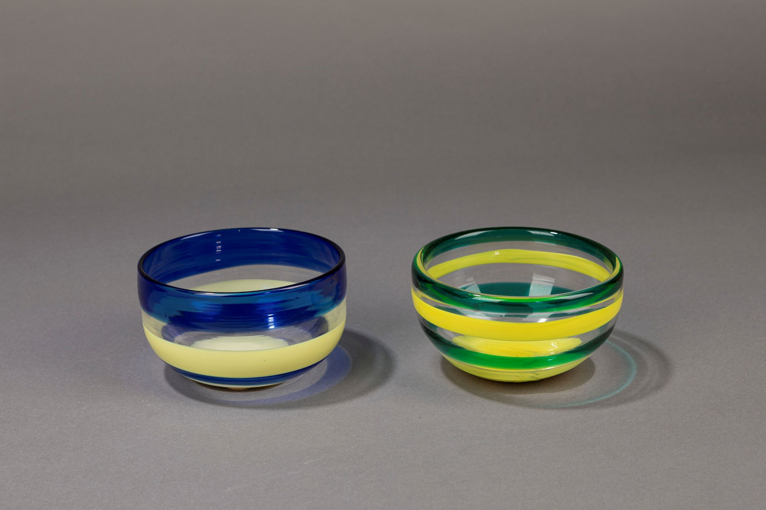 1960 ca. in vetro di Murano soffiato a fasce concentriche gialle e verdi/blu e gialle.Produzione Venini.Firma incisa Venini Italia.