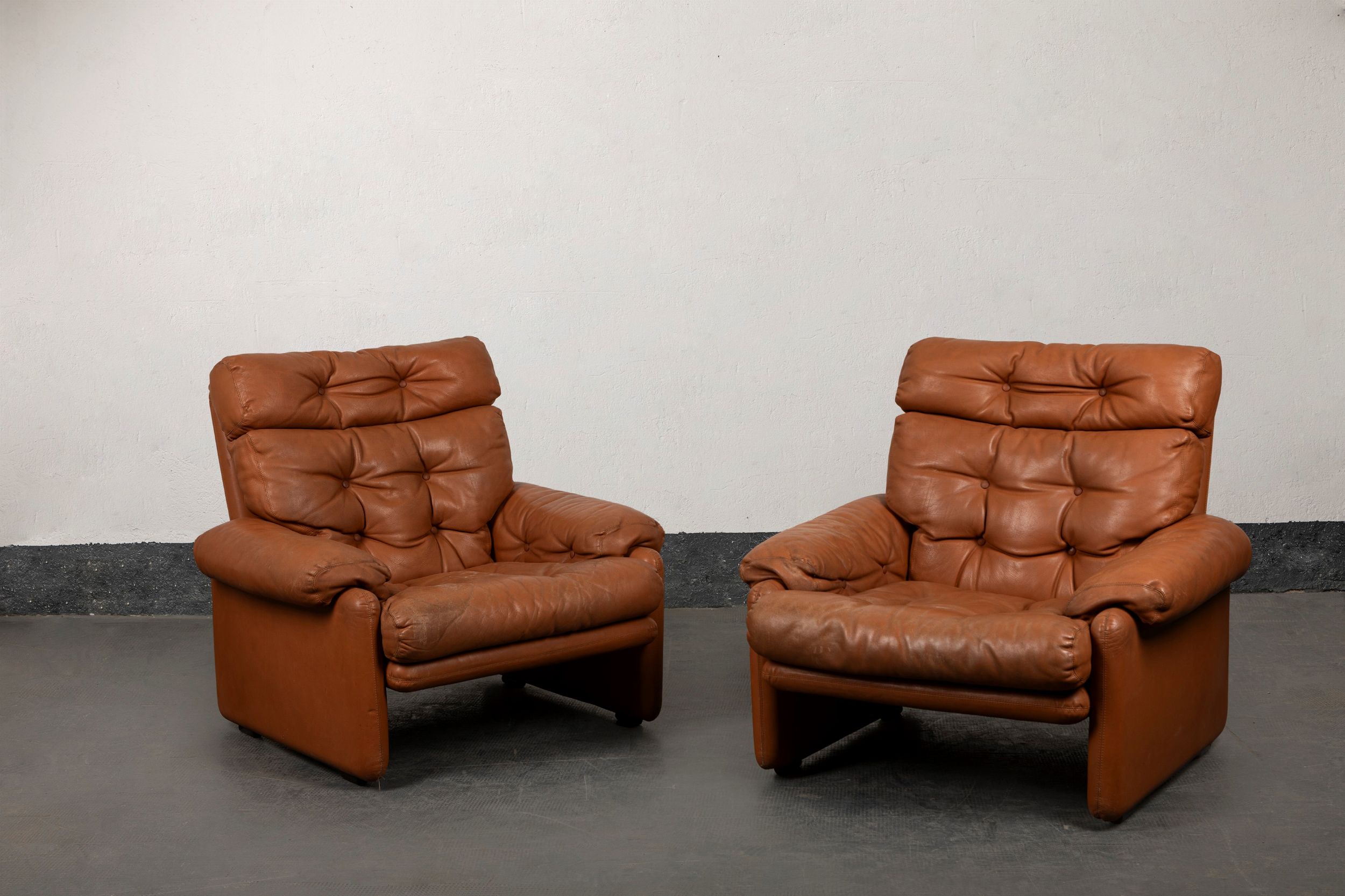 1966 Coppia di poltrone imbottite rivestite in pelle.