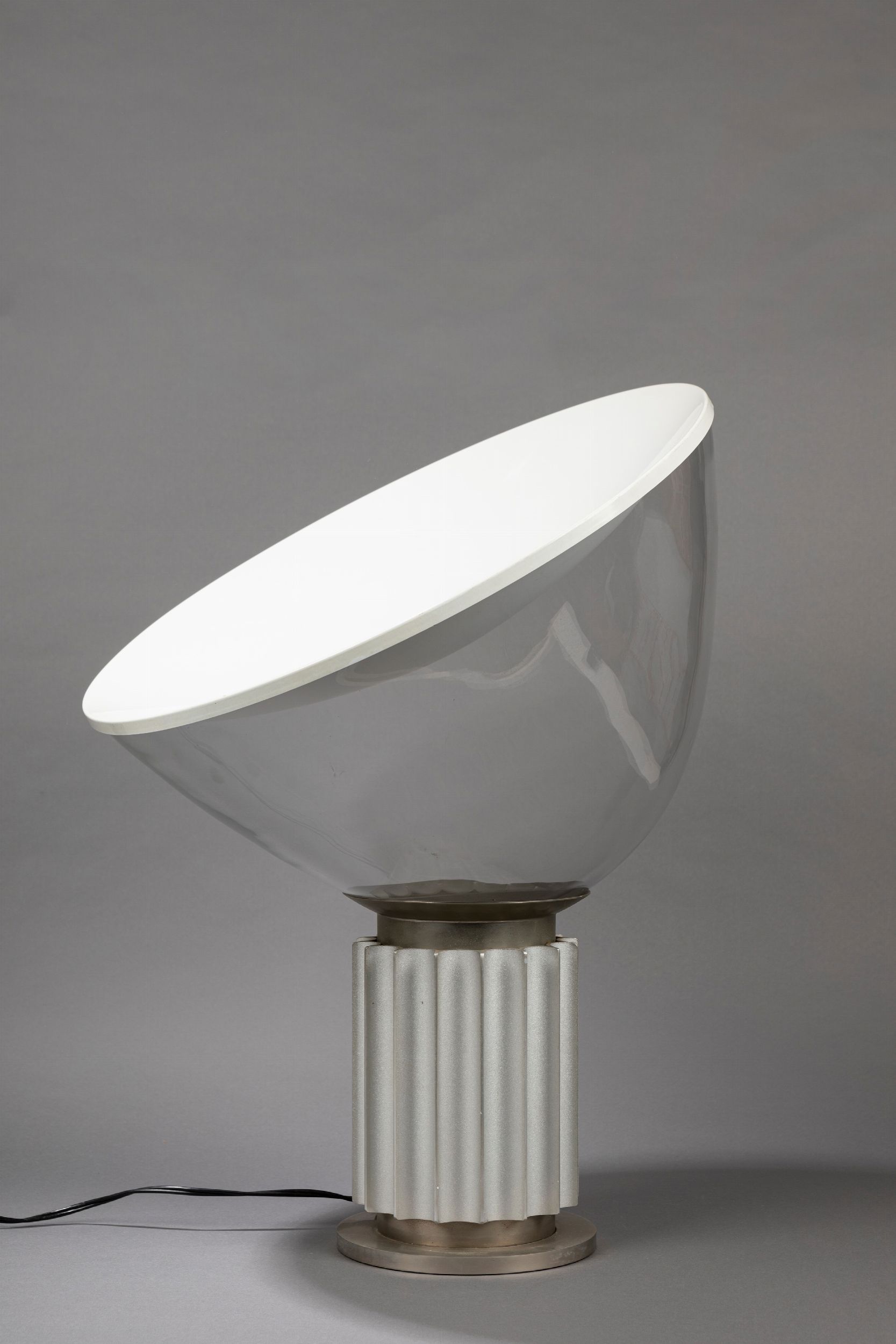 1962 Con riflettore in alluminio verniciato bianco e vetro trasparente. Corpo in alluminio e metallo nero. Produzione Flos