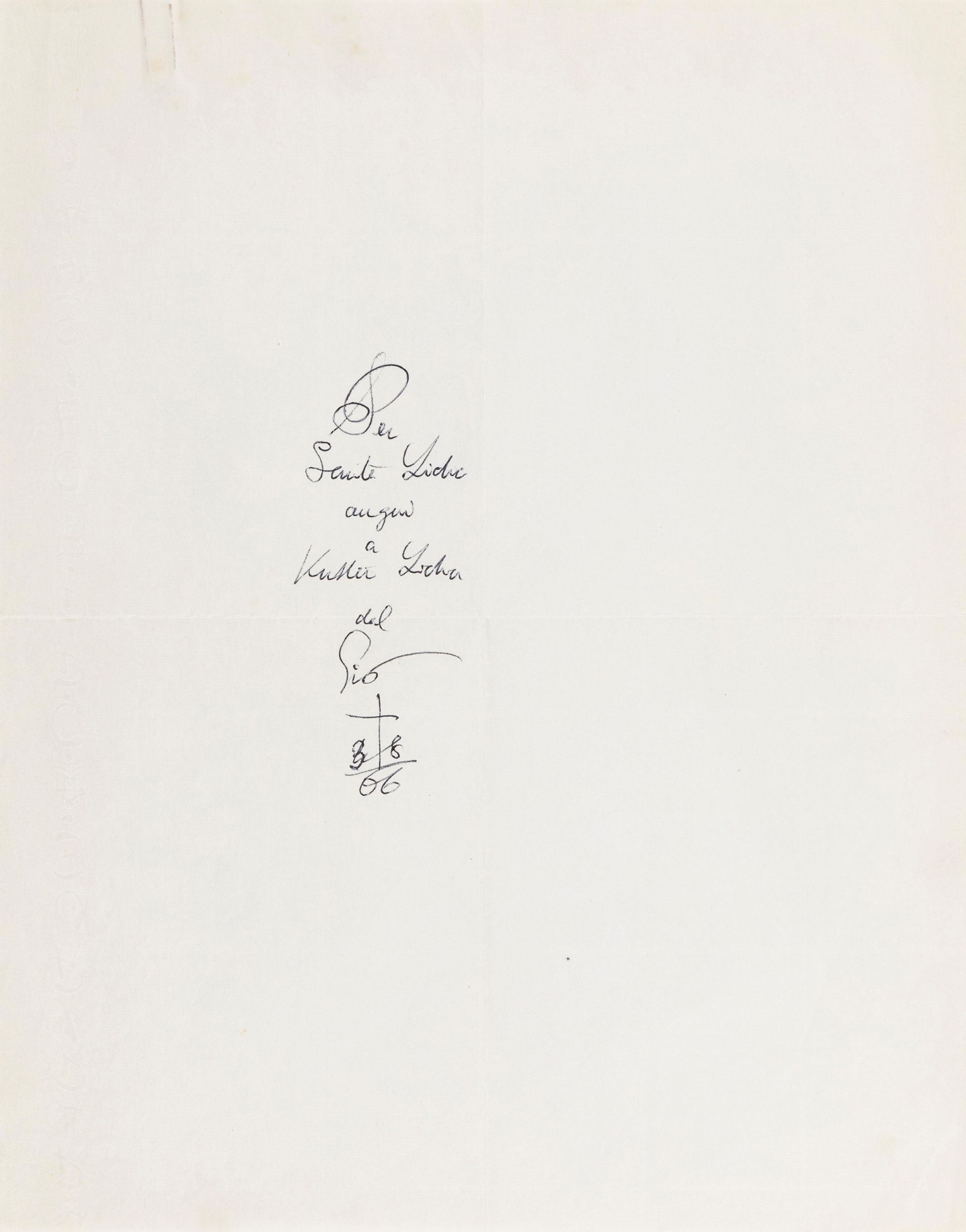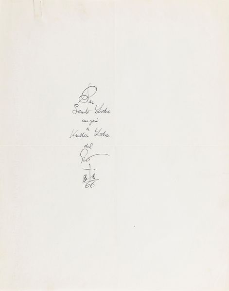 27,5 x 21,9 cm 1966 Di auguri di buon onomastico dedicato a Lidia Kuster Tabacchi, direttrice della rivista Novità. Inchiostro nero su carta. “Per Santa Lidia auguri a Kuster Lidia dal Gio 3.8.1966. ”Provenienza: Collezione privata, Torino