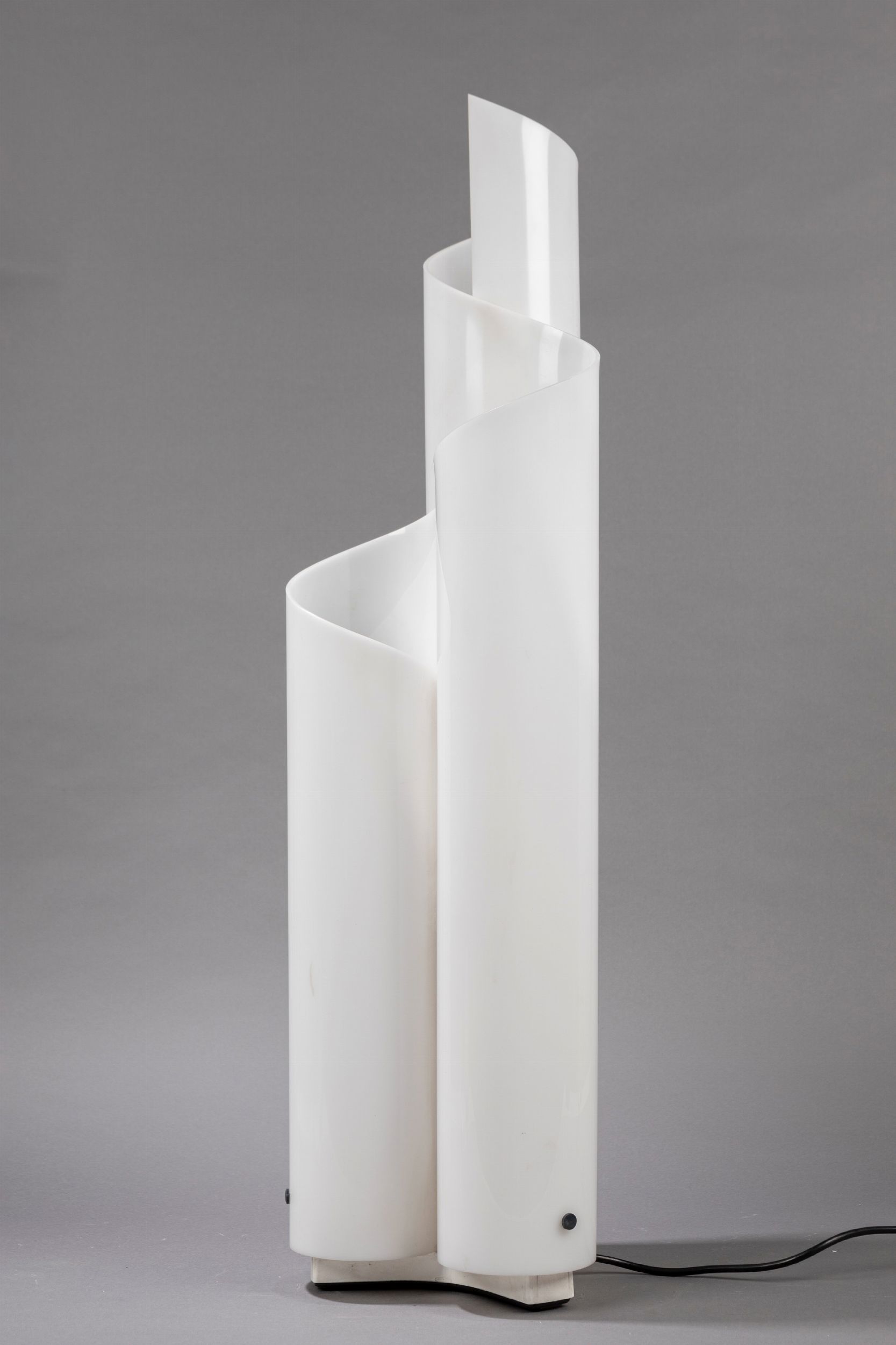 1969 Lampada da terra con base in acciaio verniciato e diffusore in metacrilato bianco piegato a caldo in più passaggi e in versi opposti.