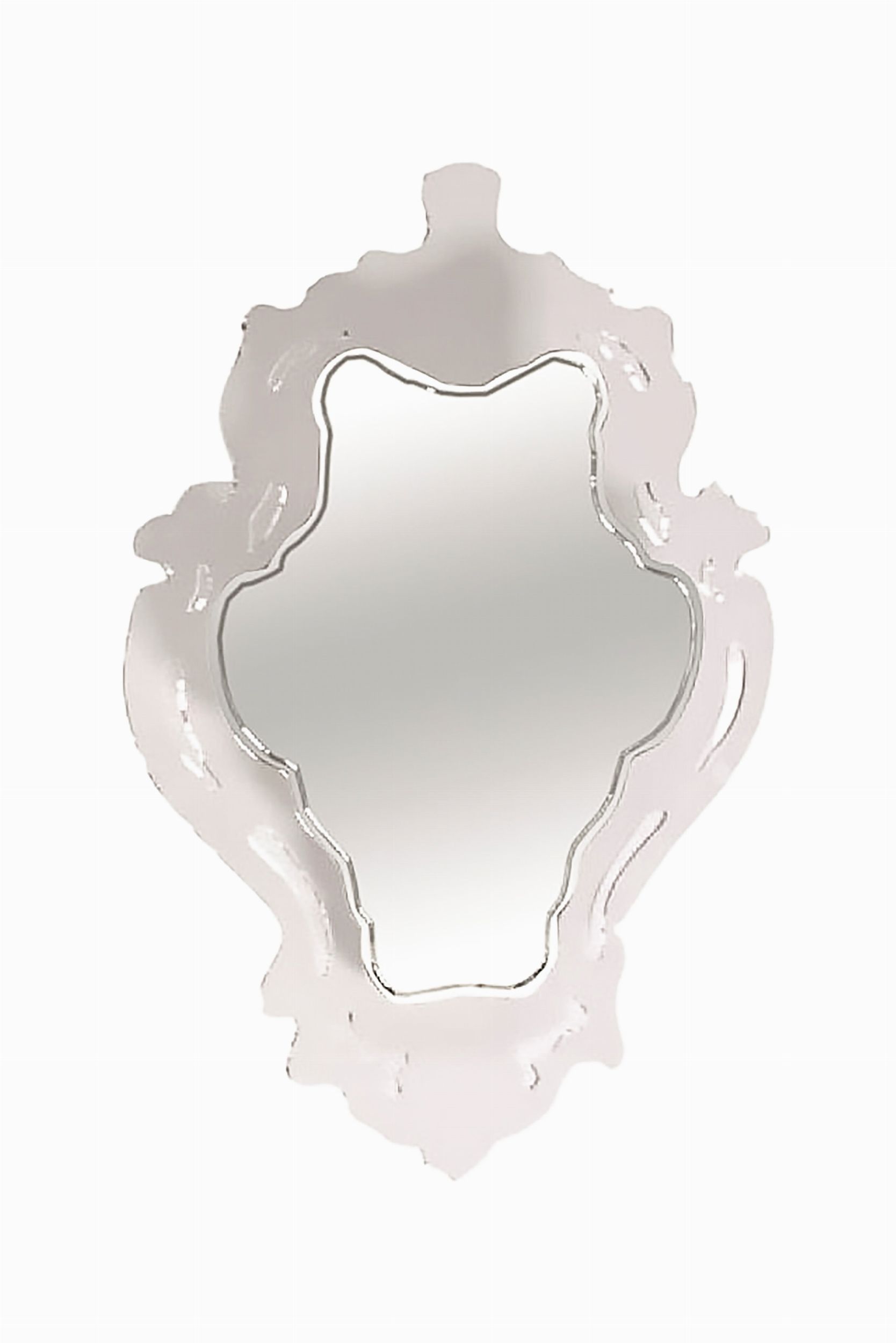 1990 ca. Specchio con cornice in vetro trasparente sagomato a forma di cornice antica.