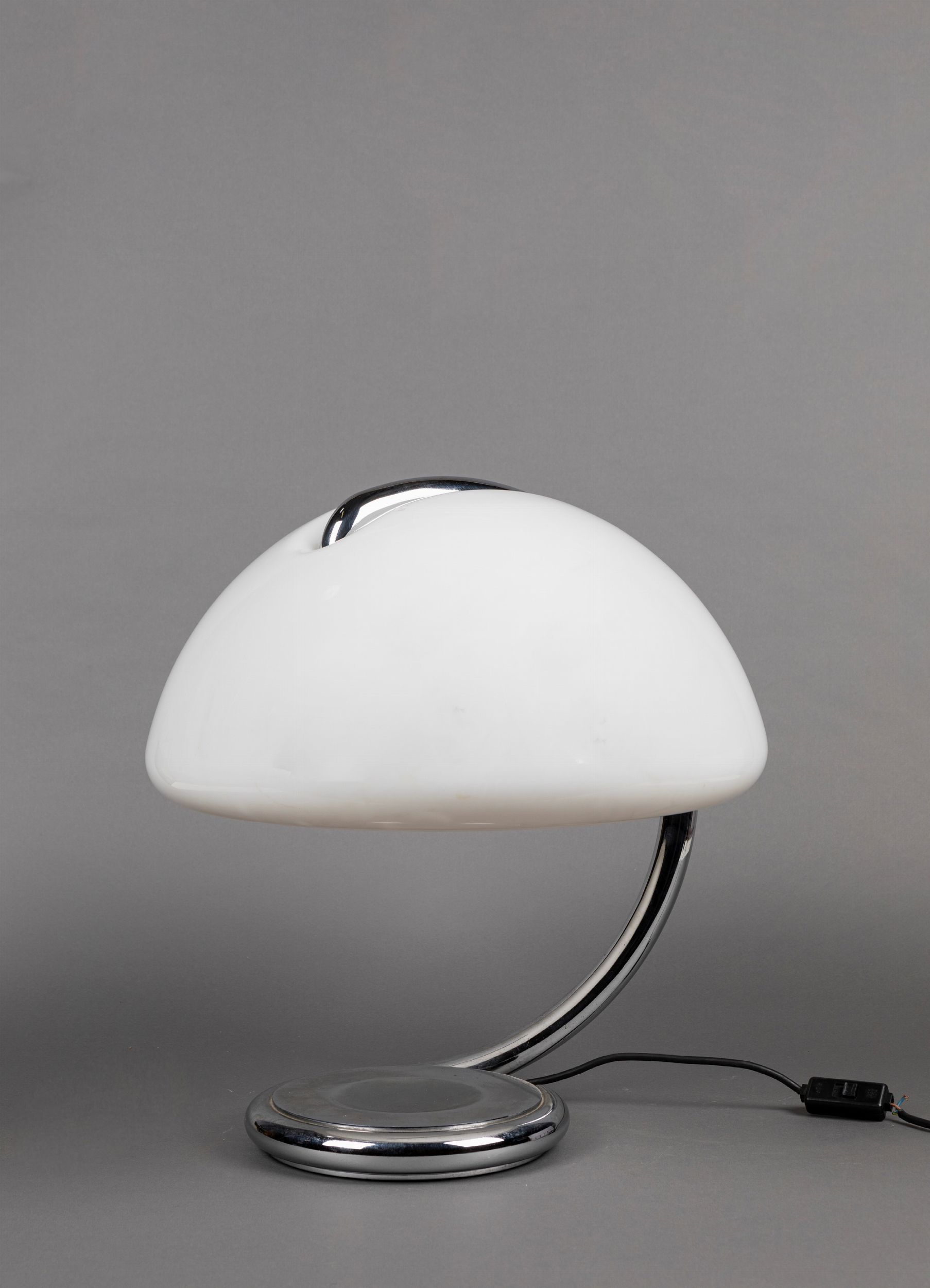 1965 Lampada da tavolo a luce diffusa con braccio girevole. Diffusore in metacrilato opale bianco. Braccio e base in metallo verniciato.