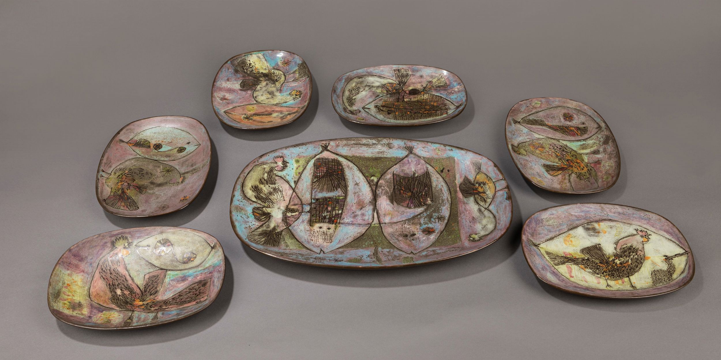 1950 ca. composto da 7 piatti in ceramica dipinta. Produzione Baratti Pesaro. Firma della manifattura.
