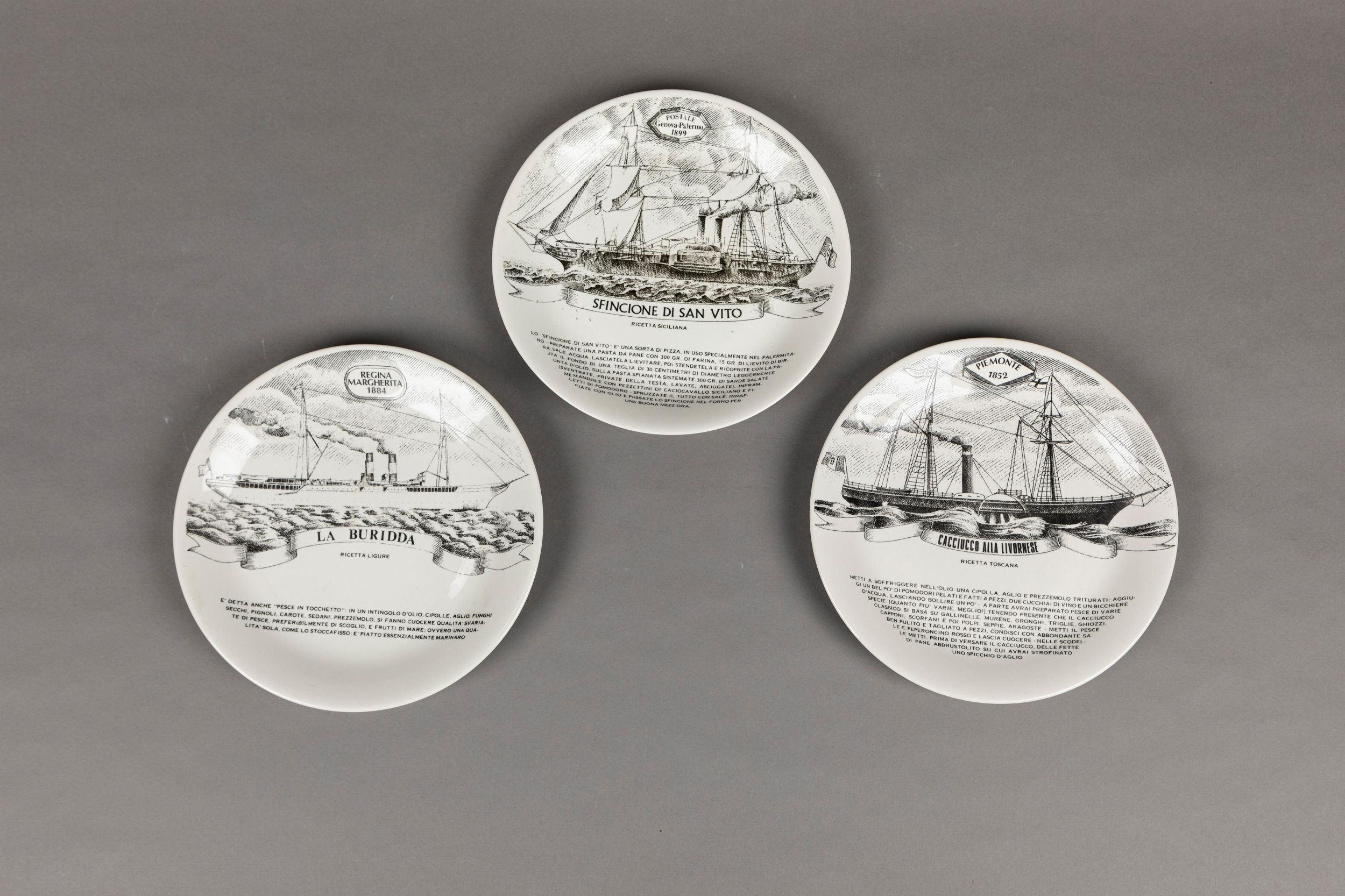 1960 ca. Composto da tre piatti della serie Vecchie Navi della Flotta Florio in porcellana con decoro serigrafato.
