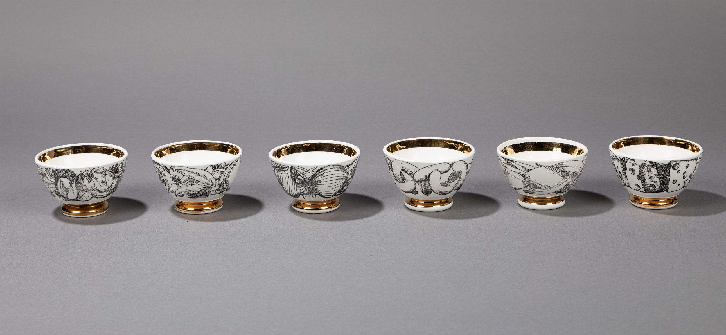 1950 ca. composto da sei coppette da pinzimonio in ceramica serigrafata e dorata.