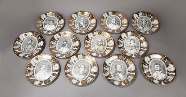 1950 ca. Collezione di dodici Piatti in porcellana serigrafati e dorati della serie “Grandi Maestri” dedicata ai compositori italiani.