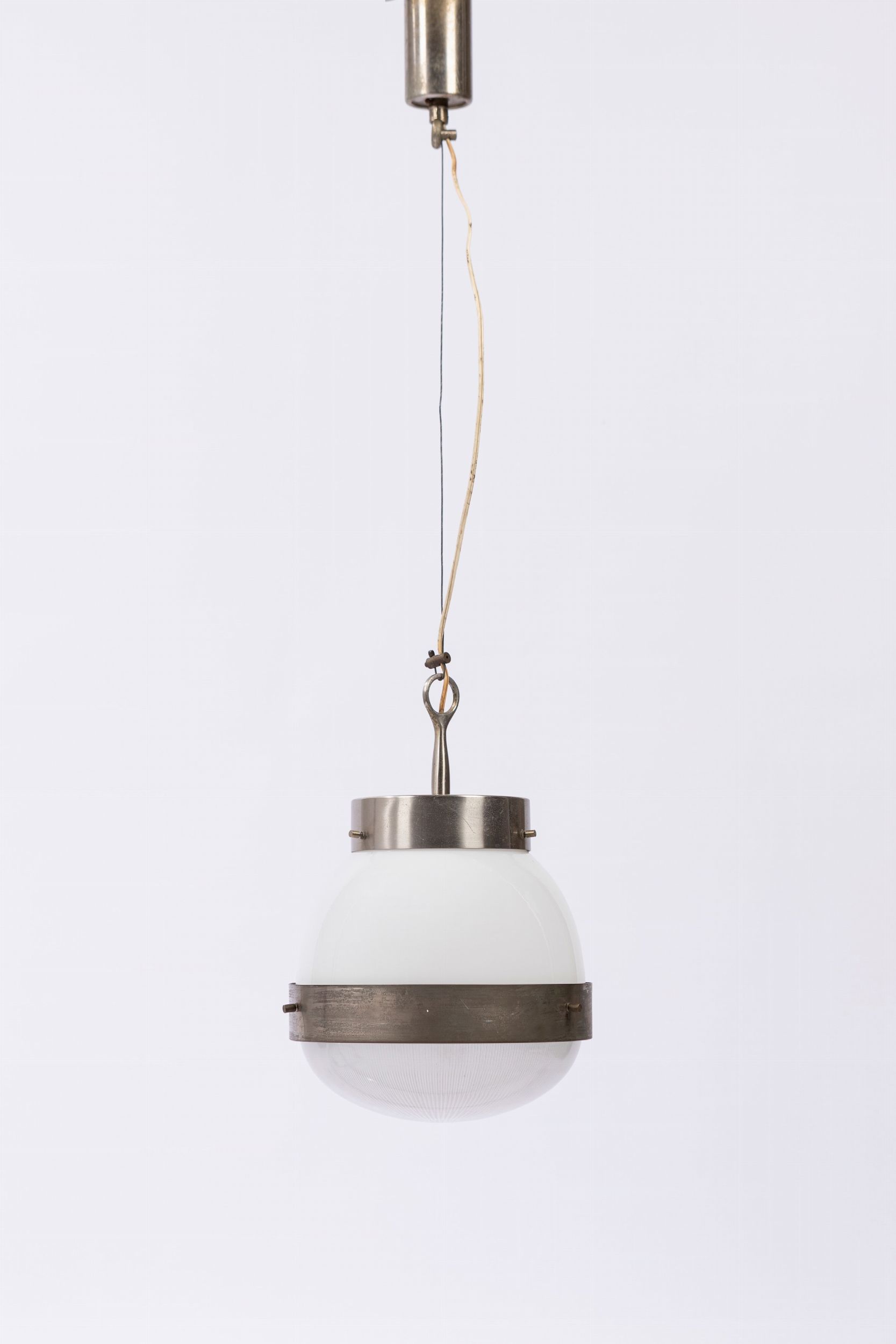 1960 ca. modello Delta in metallo nichelato, vetro bianco opalino e vetro stampato.