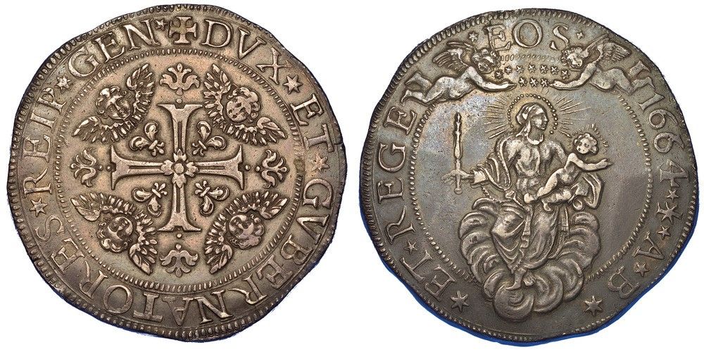 Croce patente ornata e accantonata da teste di cherubino ad ali spiegate. R/ La Beata Vergine con il Bambino in braccio, seduta sulle nubi, tiene nella mano d. uno scettro; in alto due angeli reggono una corona di stelle. CNI 3. Rarissimo. g. 76,26. Diam. mm. 57,26. Arg. SPL