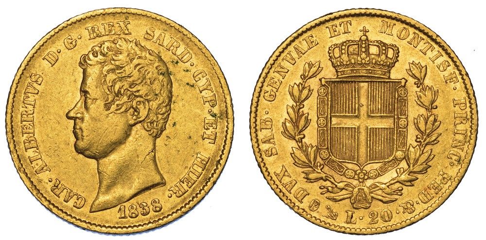 REGNO DI SARDEGNA. CARLO ALBERTO DI SAVOIA, 1831-1849. 20 Lire 1838. Genova.