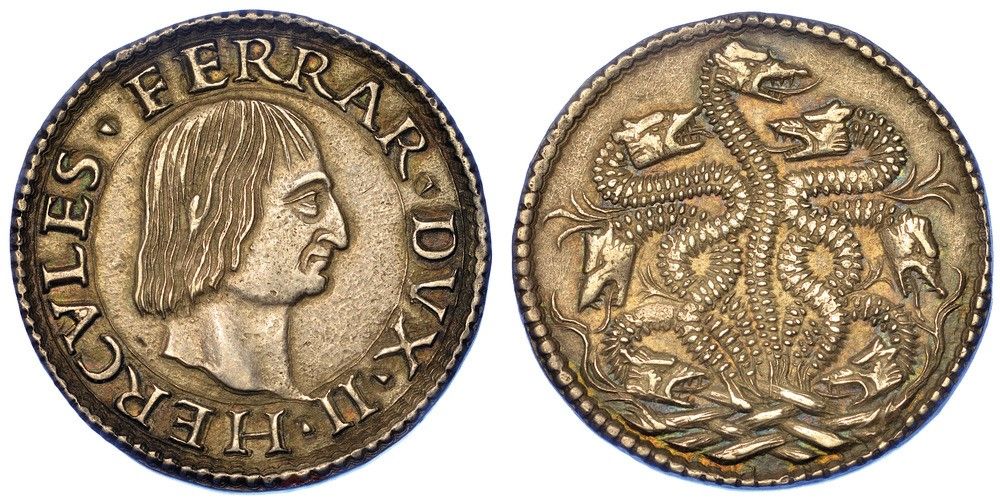Testa del duca a d. R/ (anepigrafe) Idra a sette teste sopra tizzoni ardenti. MIR 255. RMM 4. CNI 20. Molto raro. g. 7,65. Diam. mm. 27,02. Arg. q.SPL