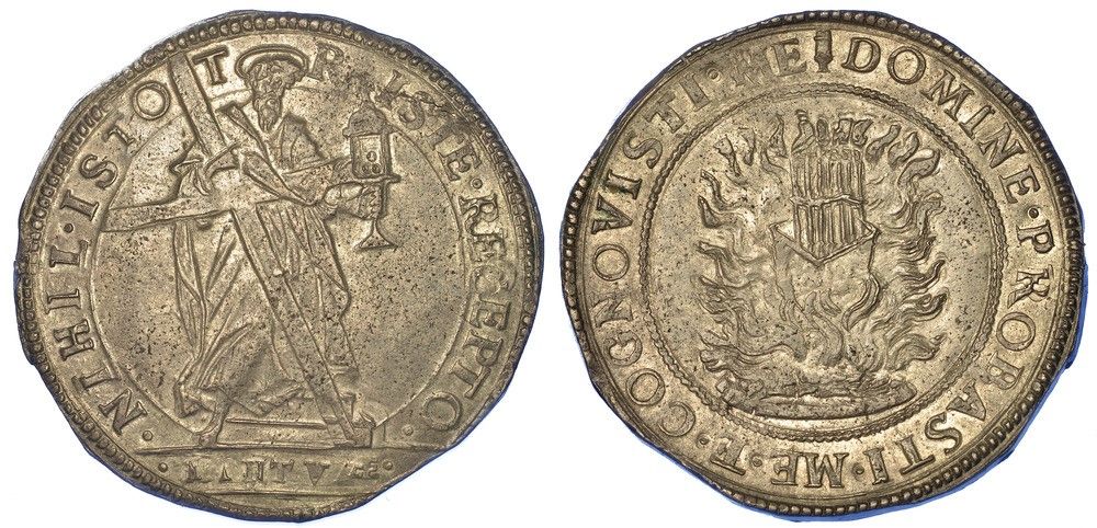 Sant'Andrea nimbato, stante di fronte, regge con la d. una lunga croce, e nella s. una pisside. All’esergo MANTVÆ. R/ Crogiuolo con le verghe d’oro sulle fiamme. MIR 660/1. CNI 8. Molto raro. g. 26,05. Diam. mm. 40,48. Arg. SPL