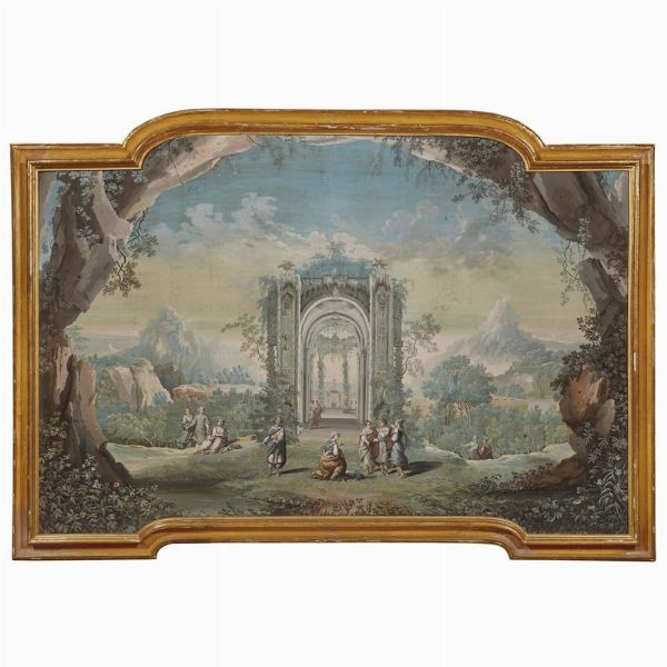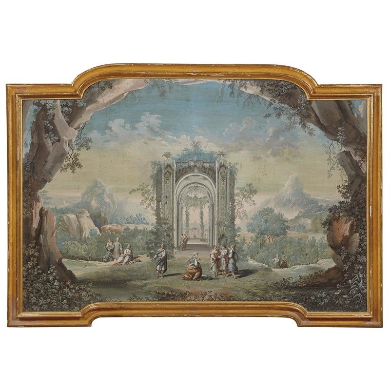 Evidente l’impianto da scenografia teatrale che nel nostro dipinto pone al centro una prospettiva architettonica a metà tra il gotico e il barocco, incorniciandola con quinte arcuate di alberi e rocce.