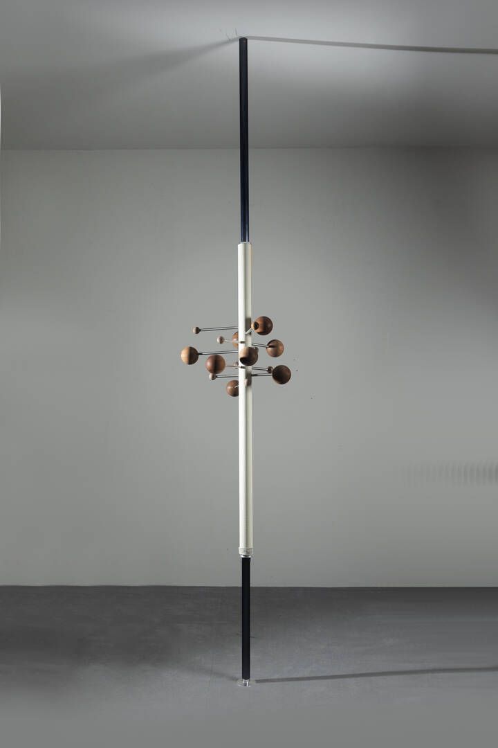 Appendiabiti a colonna in alluminio verniciato pelle e legni diversi. Etichetta del produttore. Prod. Tecno produzione recente h cm 305x50