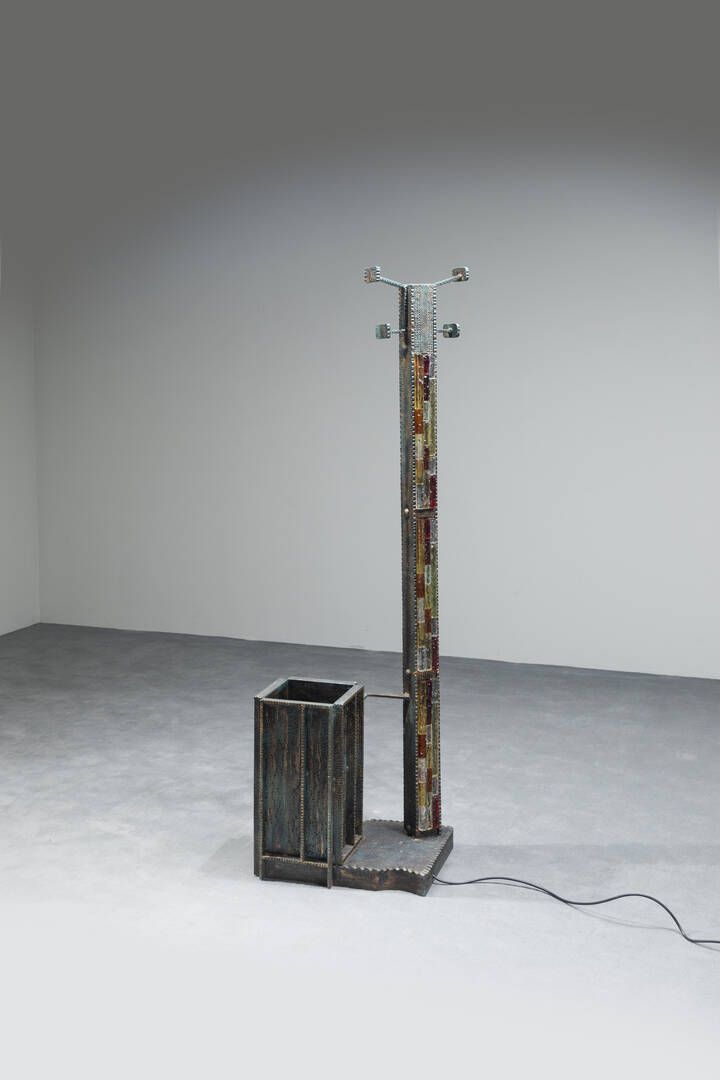 Struttura in bronzo particolari in vetro colorato scalpellato. Anni '70 attaccapanni h cm 172x50x40 portaombrelli cm 52x26x26 Difetti