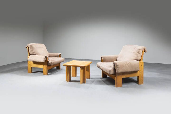 Coppia di poltrone in legno massello e imbottitura rivestita in tessto e tavolino in legno massello. Anni '80 cm 92x80x92 cm 46x60x60 Difetti
