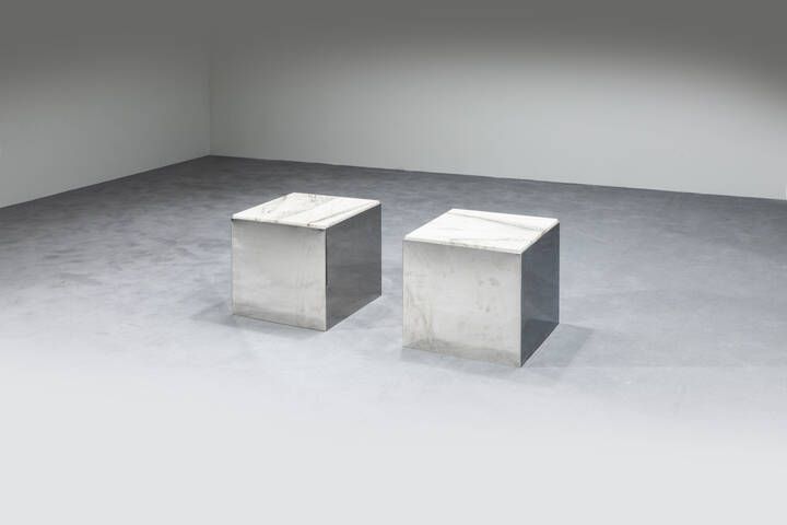 Coppia di tavolini in acciaio lucidato piani in marmo. Anni '70 cm 49x47x47