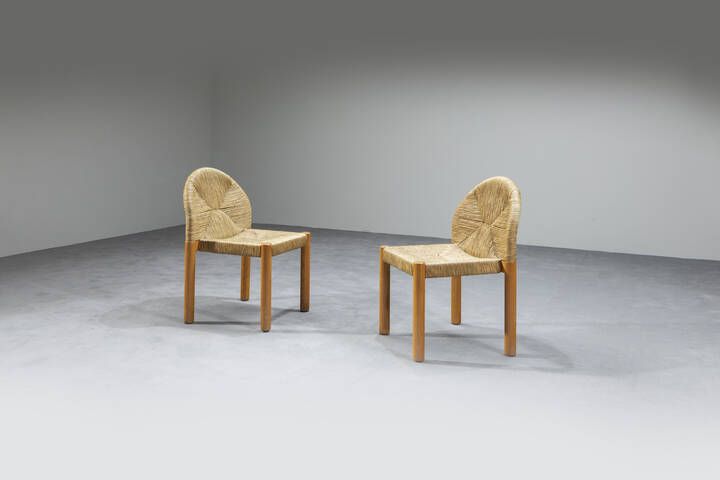 Struttura in legno con sedile e schienale impagliati. Prod. Pozzi 1979 cm 78x56x51 Bibl.: Giuliana Gramigna Repertorio del design italiano 1950-2000 Ed. Mondadori Arnoldo 1985 p. 470 Difetti