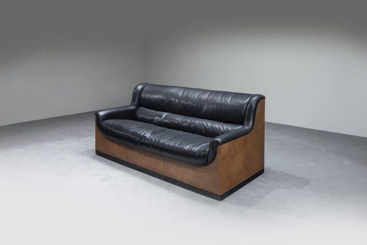 Struttura in legno rivestita in pelle e imbottitura rivestita in pelle. Etichetta del produttore Anni '70 cm 82x75x80 Difetti