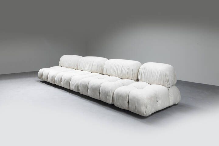 Quattro moduli in fibra di legno metallo cromato e imbottitura in poliuretano rivestita in tessuto. Etichetta del produttore Prod. B&B anni '70 3 da cm 70x90x90 1 da cm 70x60x90 Bibl.: Domus n.505 (dicembre 1971) pagina pubblicitaria Piccoli difetti