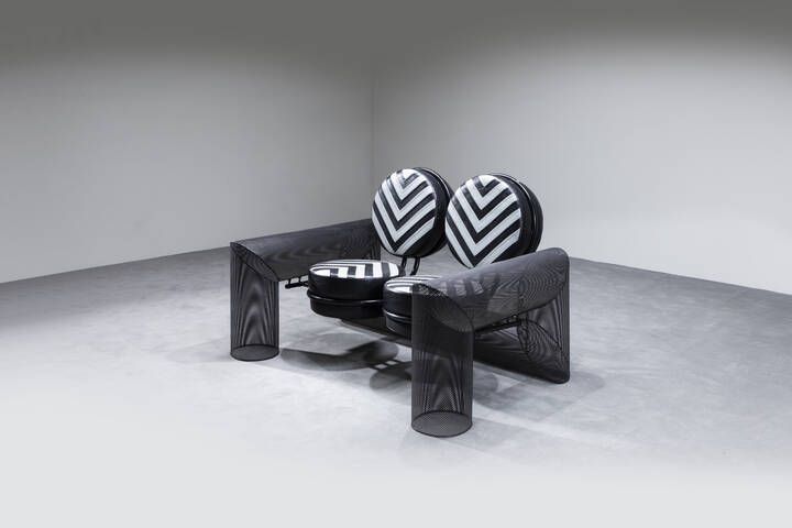 Struttura in acciaio forato e verniciato sedile e schienale in poliuretano espanso rivestiti in pelle bicolore. Prod. Alias 1985 cm 97x153x108 Bibl.: Catalogo Alias 1988 p.n.