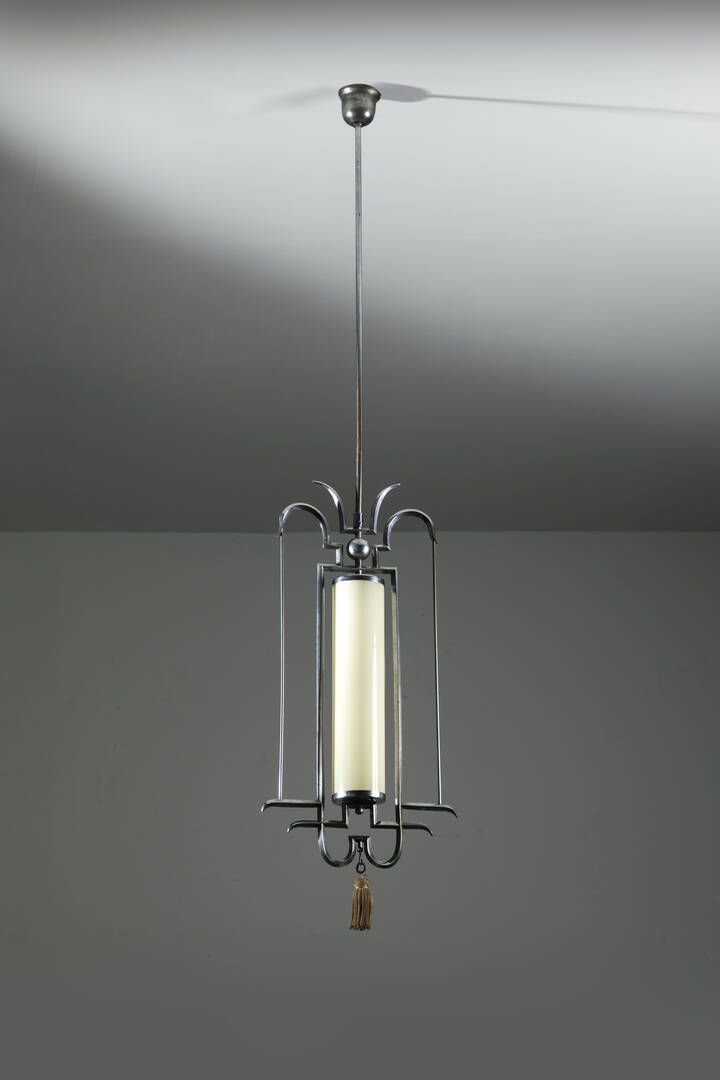 Struttura in metallo cromato diffusore in vetro opalino. Anni '40 h cm 140x31
