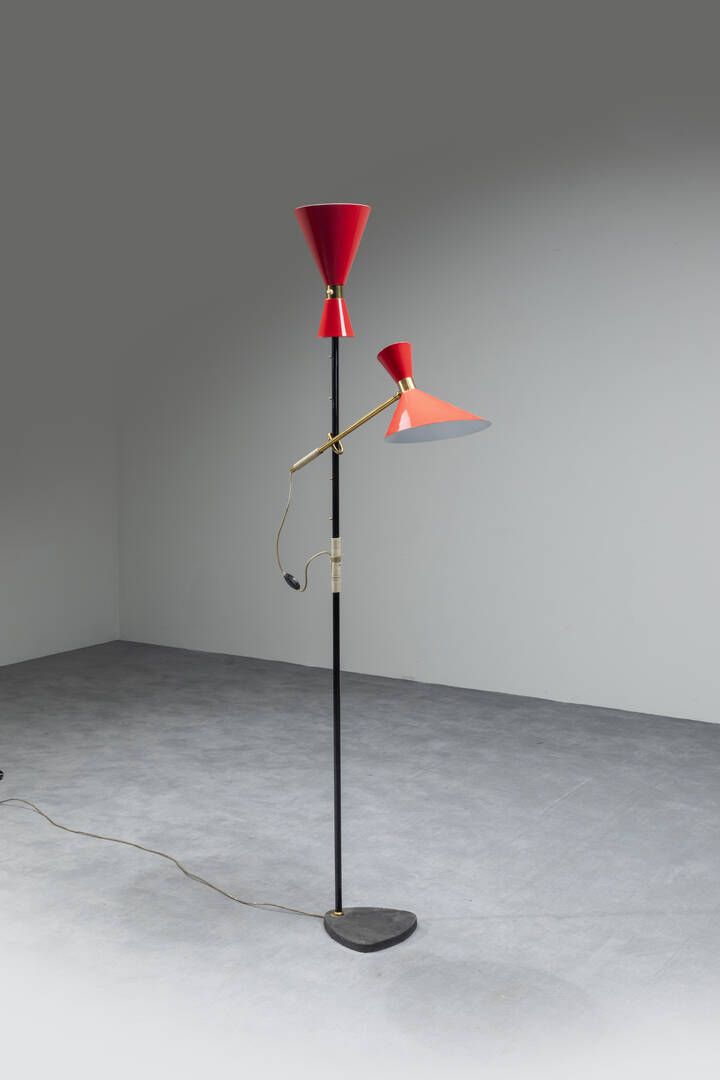 Struttura in ottone e metallo laccato e diffusore orientabile in alluminio laccato. Base in ghisa. Anna '50 h cm 181 5x63 Piccoli difetti