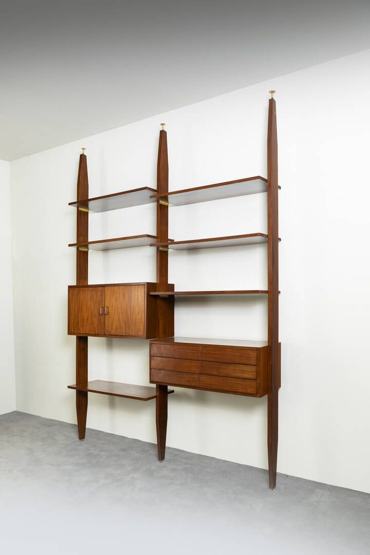 Libreria cielo/terra a due campate piani e contenitori in legno particolari in ottone. Anni '60 296x208x40 Piccoli difetti