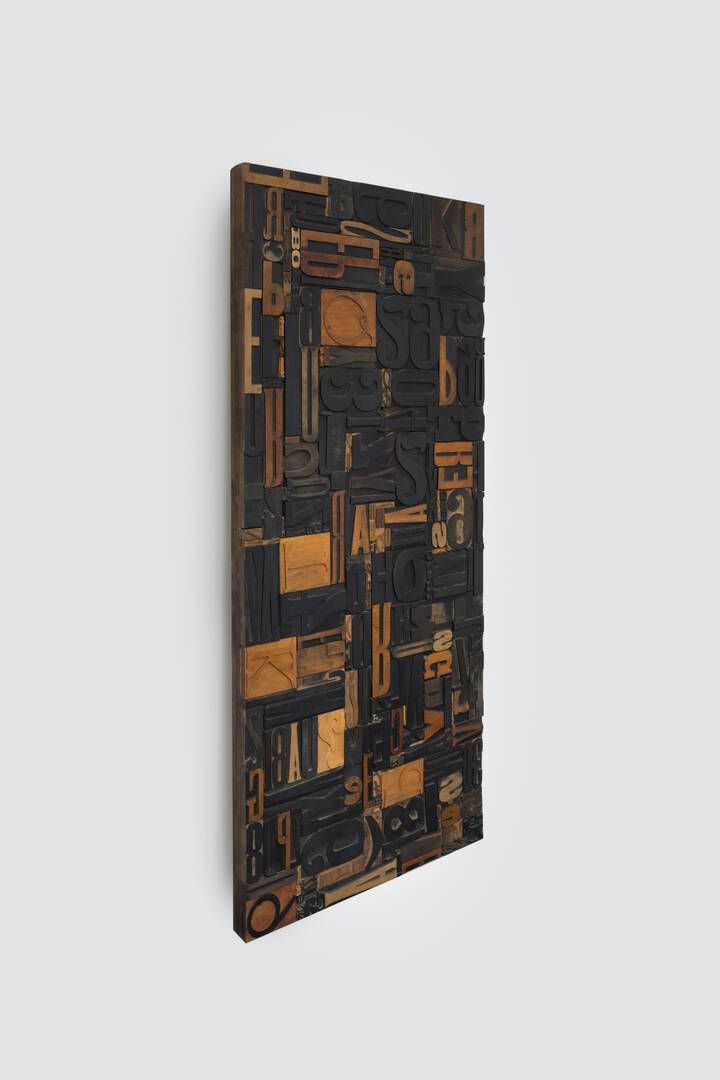 Scultura su pannello di legno ad intarsi alfabetici e numerici. Anni '70 cm 170x72 5x6 5 Piccoli difetti