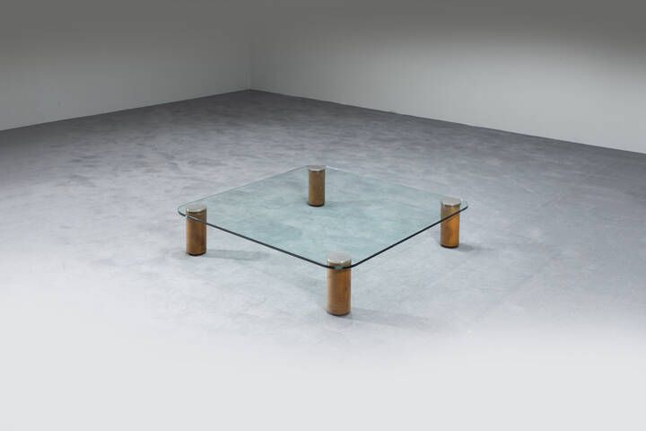 Tavolino con piedi in legno piano in vetro e particolari in acciaio. Prod. Zanotta anni '70 cm 23x100x100