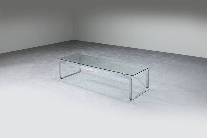 Struttura in acciaio con perni di supporto e piano vetro con angoli stondati. Anni '60 cm 36x150x51 5
