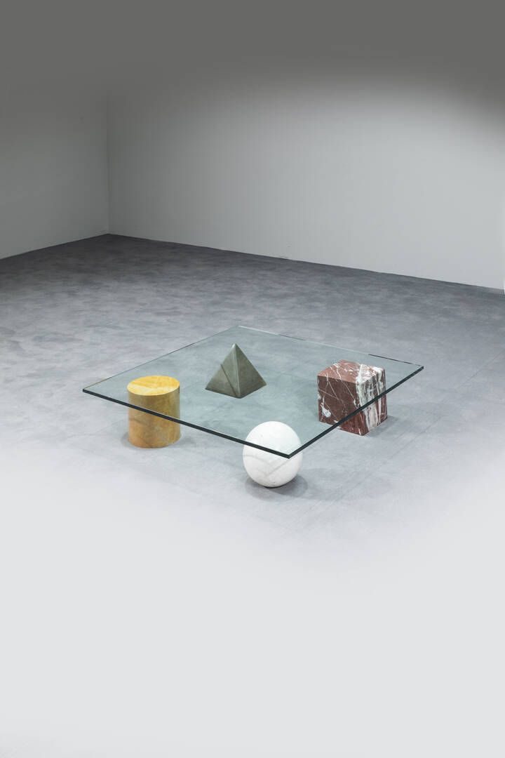 Basi geometriche in marmo colorato e piano in vetro. Prod. Casigliani 1979 cm 22x96x96 Bibl.: Giuliana Gramigna Repertorio del design italiano 1950-2000 Allemandi 2011 p. 266