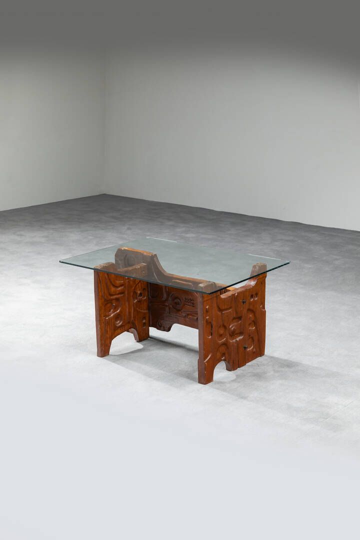 Struttura in legno lavorato e piano in vetro. Anni '60 cm 41x80x58 Difetti