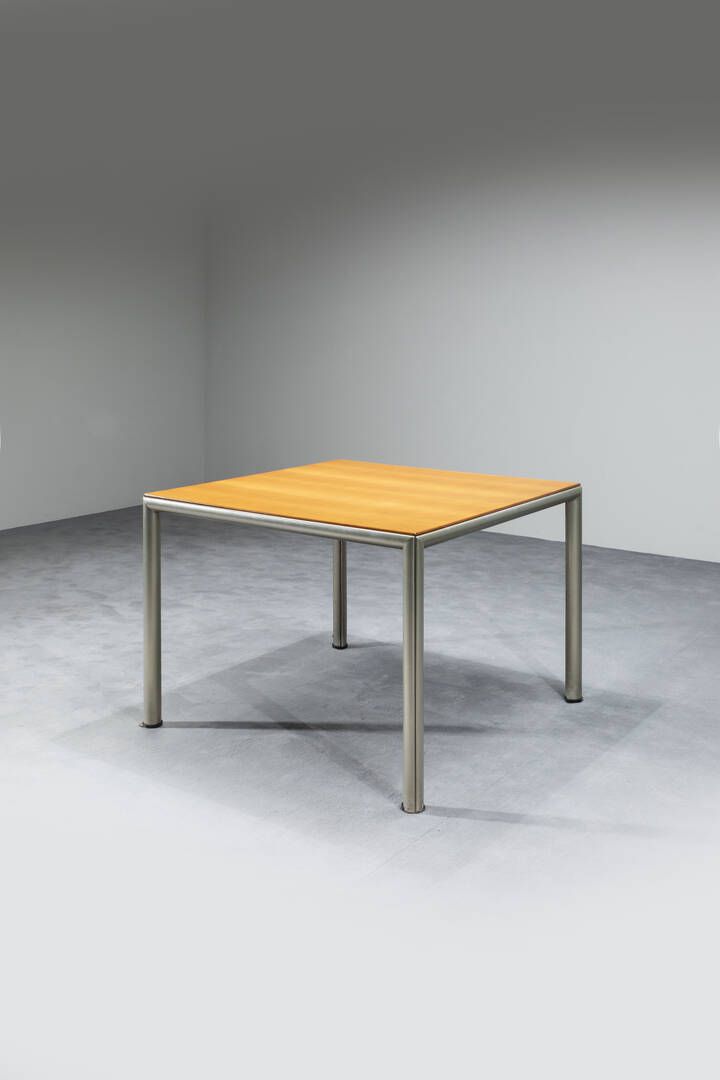 Tavolo con struttura in acciaio e piano in legno. Anni '80 cm 71 5x100x100 Dif [..]