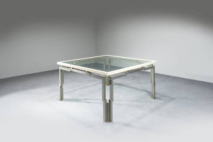 Tavolo con struttura in metallo e legno laccato piano in vetro. Anni '70 cm 75x137x137 [..]