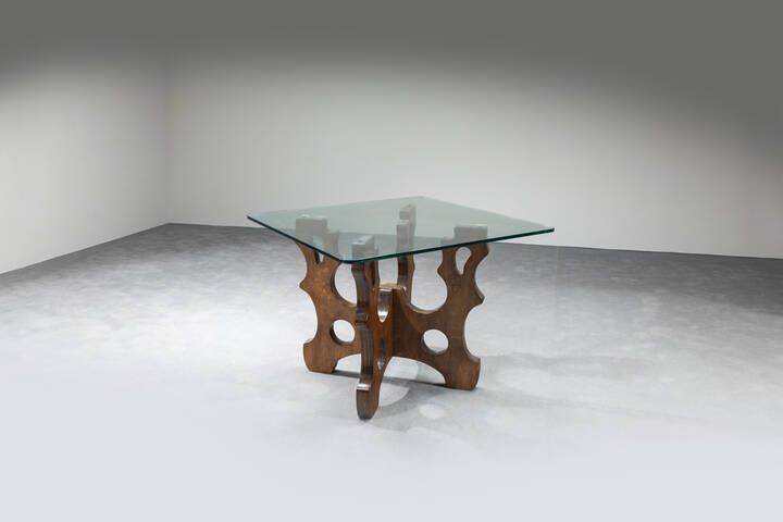 Struttura in legno piano in vetro. Anni '60 cm 75x103x103