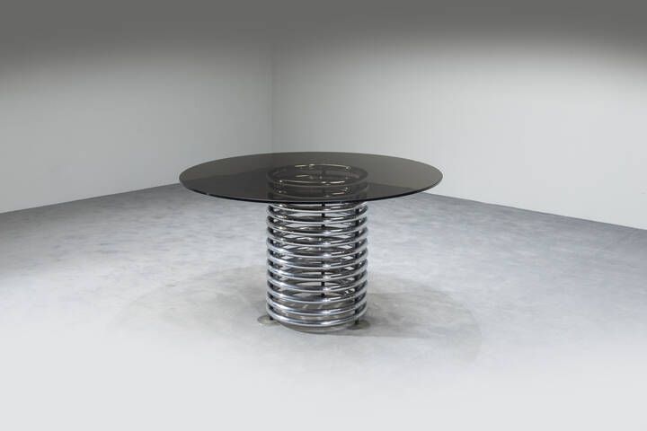 Base a spirale in acciaio cromato e piano in vetro fumè. Anni '70 cm 72x129x129 Difetti