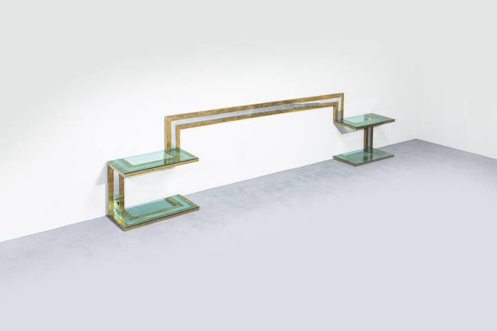 Testiera di letto in metallo cromato metallo ottonato cristallo colorato e molato. Anni '70 cm 68x300x30