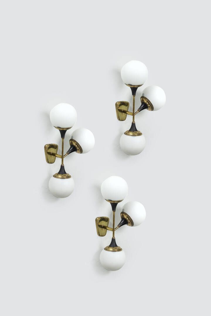 Struttura in ottone e metallo laccato sfere in vetro opalino. Anni '50 h cm 43x23x16